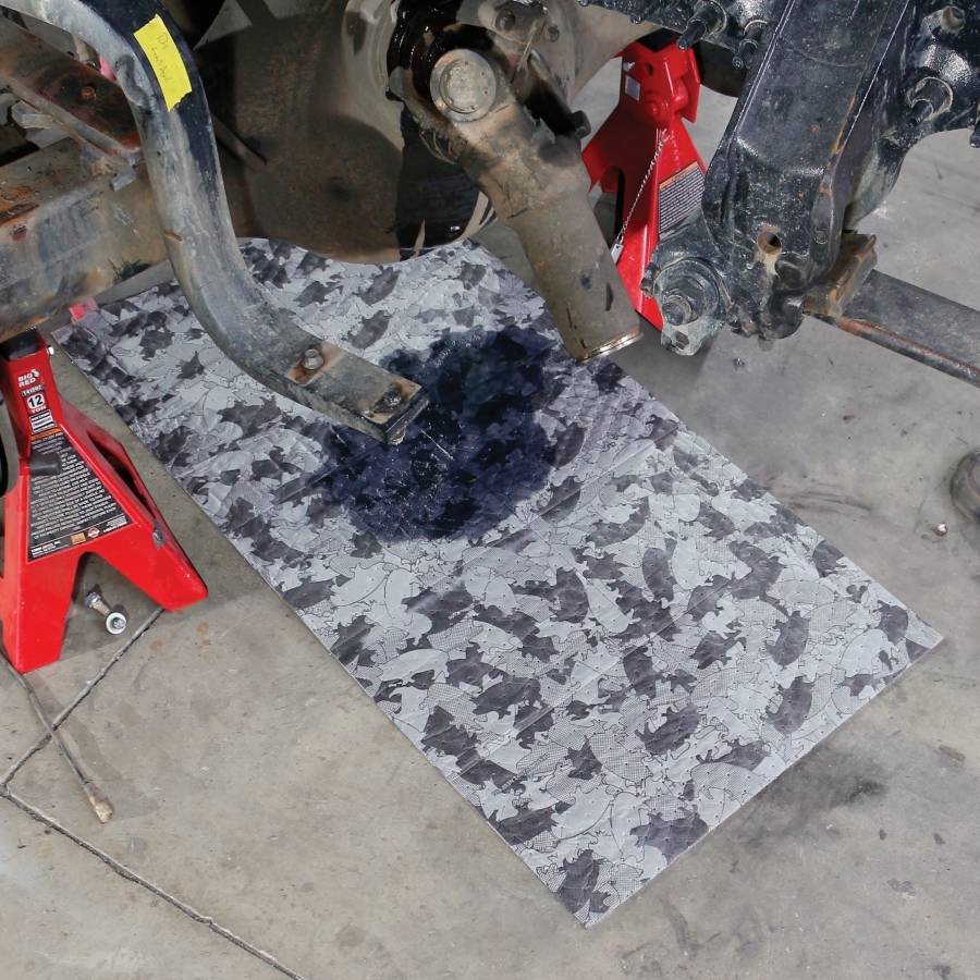 Use our camo mat anywhere to line benches and toolboxes to catch drips and overspray around machinery in oil and service pits or on top of counters.